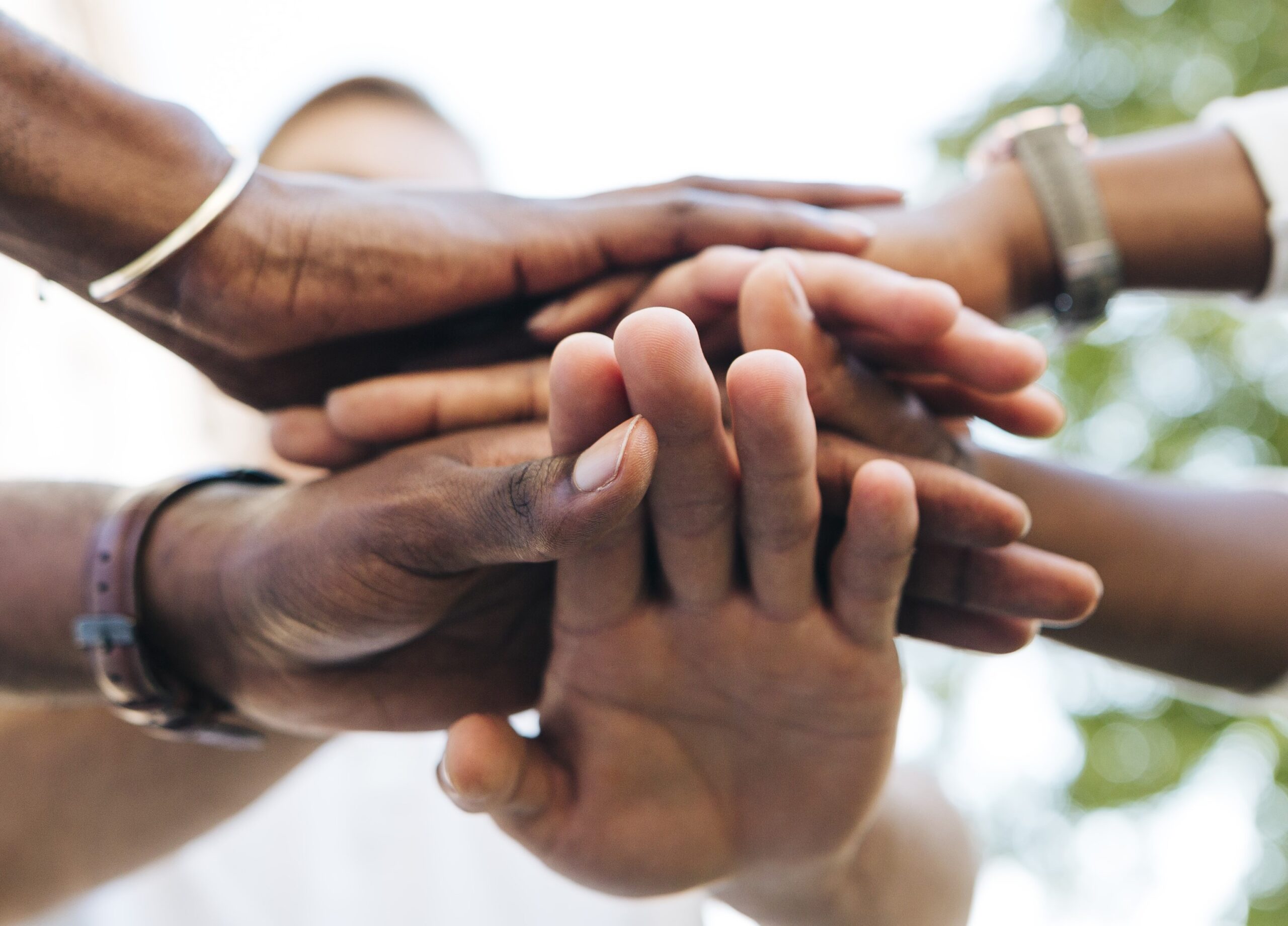Group of happy african volunteers hugs in park. Africa volunteering, charity, people and ecology concept.